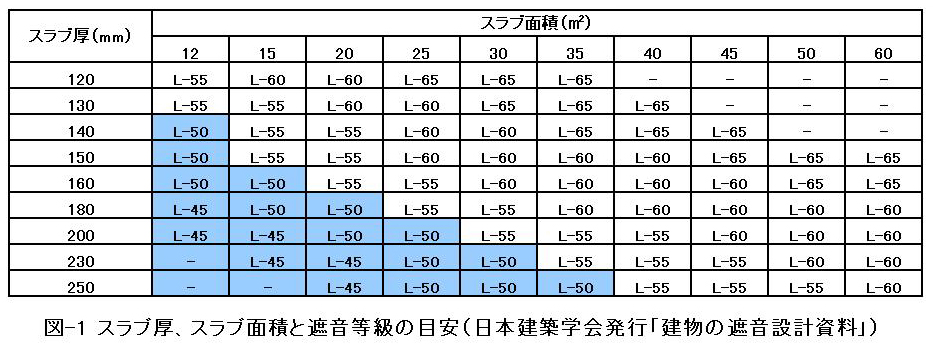 図-1は日本建築学会によるスラブ厚とスラブ面積と遮音性の関係の表です。