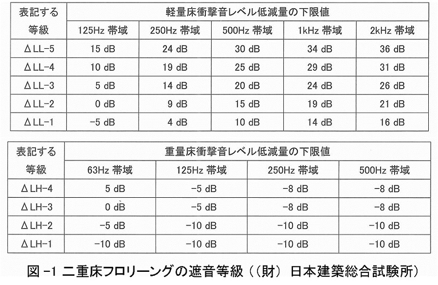 床材であるフローリングの遮音等級は、2008年まではL-50のように表記されていましたが、この「推定L値」とよばれる表記が建物自体の遮音性能を示す「L値」と誤解されやすいこと、また統一された試験方法がなかったなどの理由から廃止になり、現在は(財)日本建築総合試験所「床材の床衝撃音低減性能の等級表示指針」に基いた⊿等級(デルタ等級)が新しい基準として使われています(図-1)。