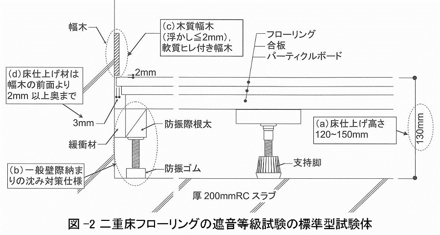図-2はポイント3でみたフローリングの遮音等級を評価する際の基準とされている標準型試験体の断面です(『集合住宅の音環境 – 乾式二重床のQ&A – (改定) 床衝撃音研究会』)。