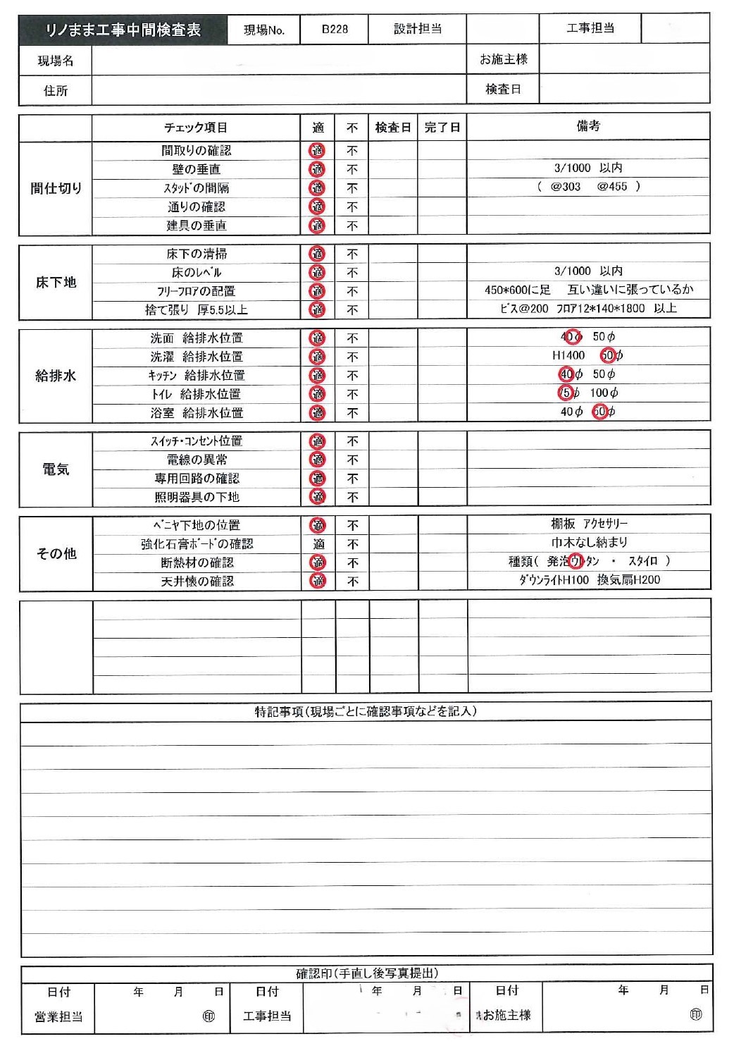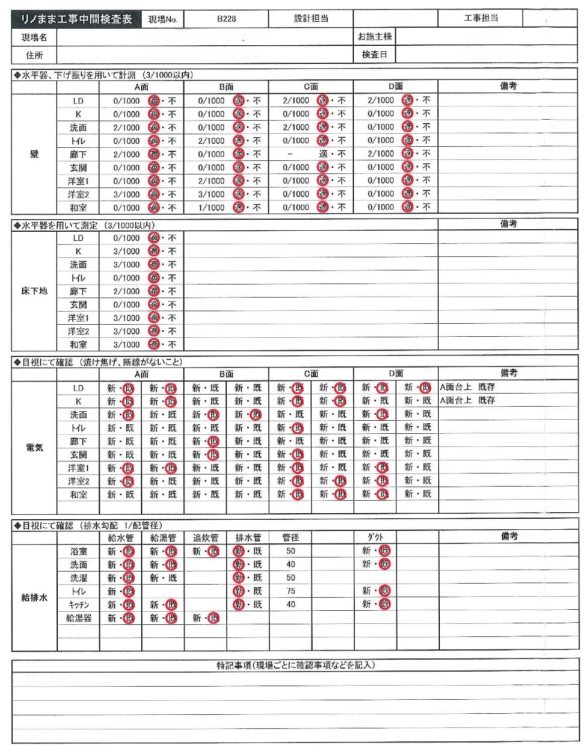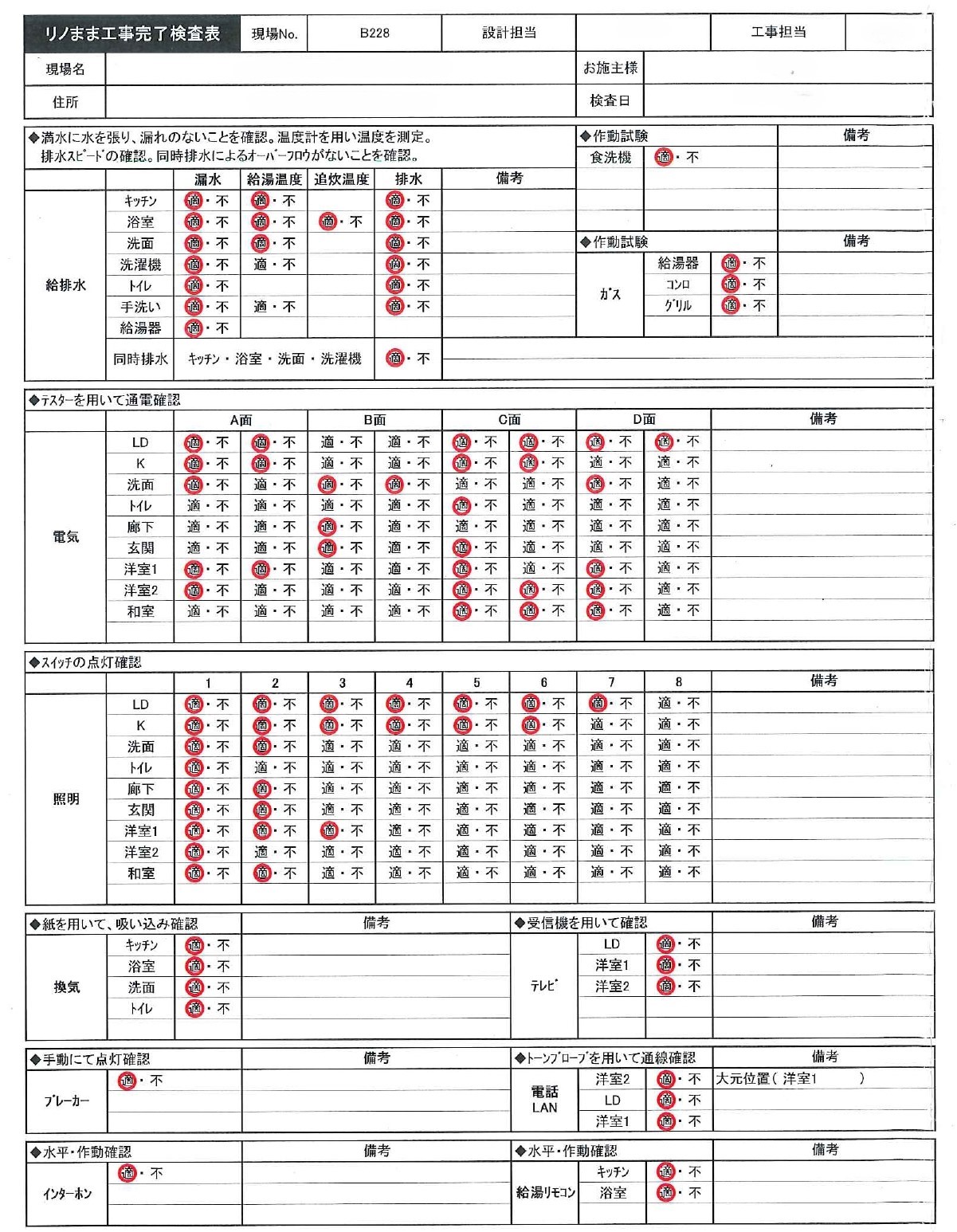 リノままの検査チェックリスト。壁や床の垂直水平や、換気扇の換気具合、各コンセントの通電状況などおよそ350箇所をチェックし、万全の状態でお引き渡しします。