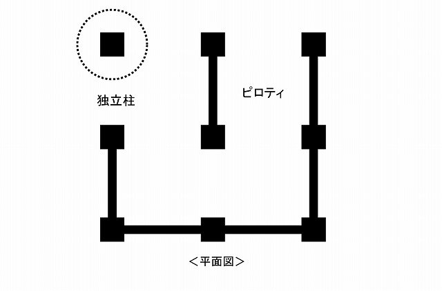 1階が駐車場や通路になっており、壁が少ないピロティ形状も一般的には耐震性においては不利とされています。住宅金融支援機構の基準では特に隅の部分に耐力壁がない独立柱となっていないかどうかを指摘しています。