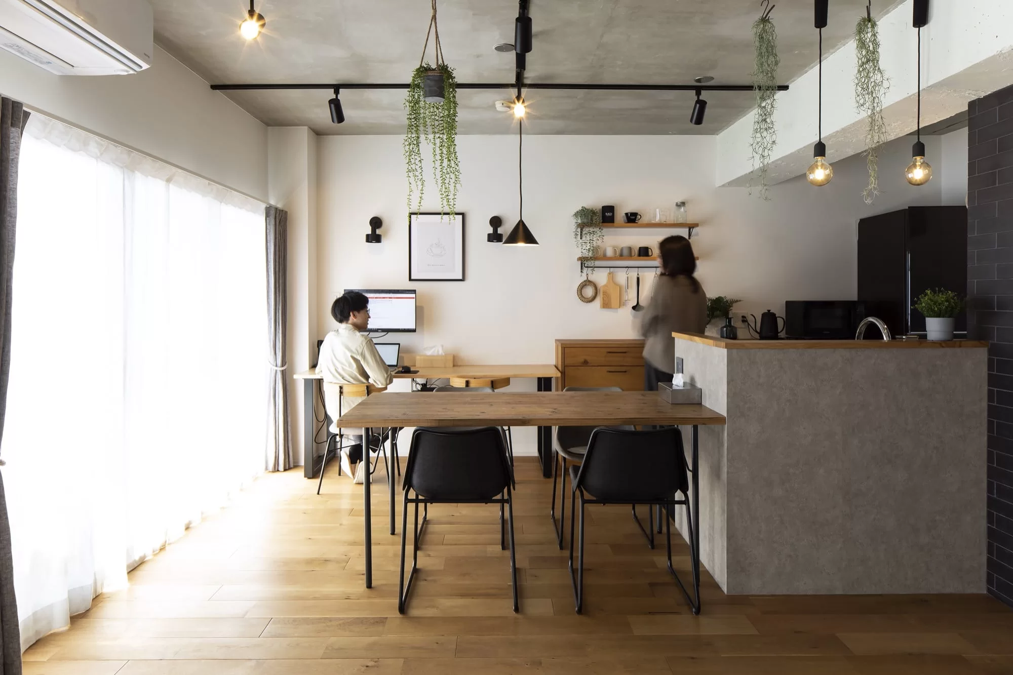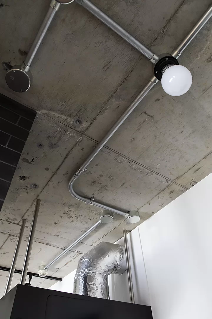 リノベーションではラフな味わいのコンクリトートスラブを見せながら排気ダクトや電気配線をあえて露出させて取りつけ、ダクトレールを使ってお気入りにスポットやペンダントを設けるなど、新築の分譲マンションの整然としたインテリアにはない、ちょっとハードな雰囲気の空間が楽しめます。