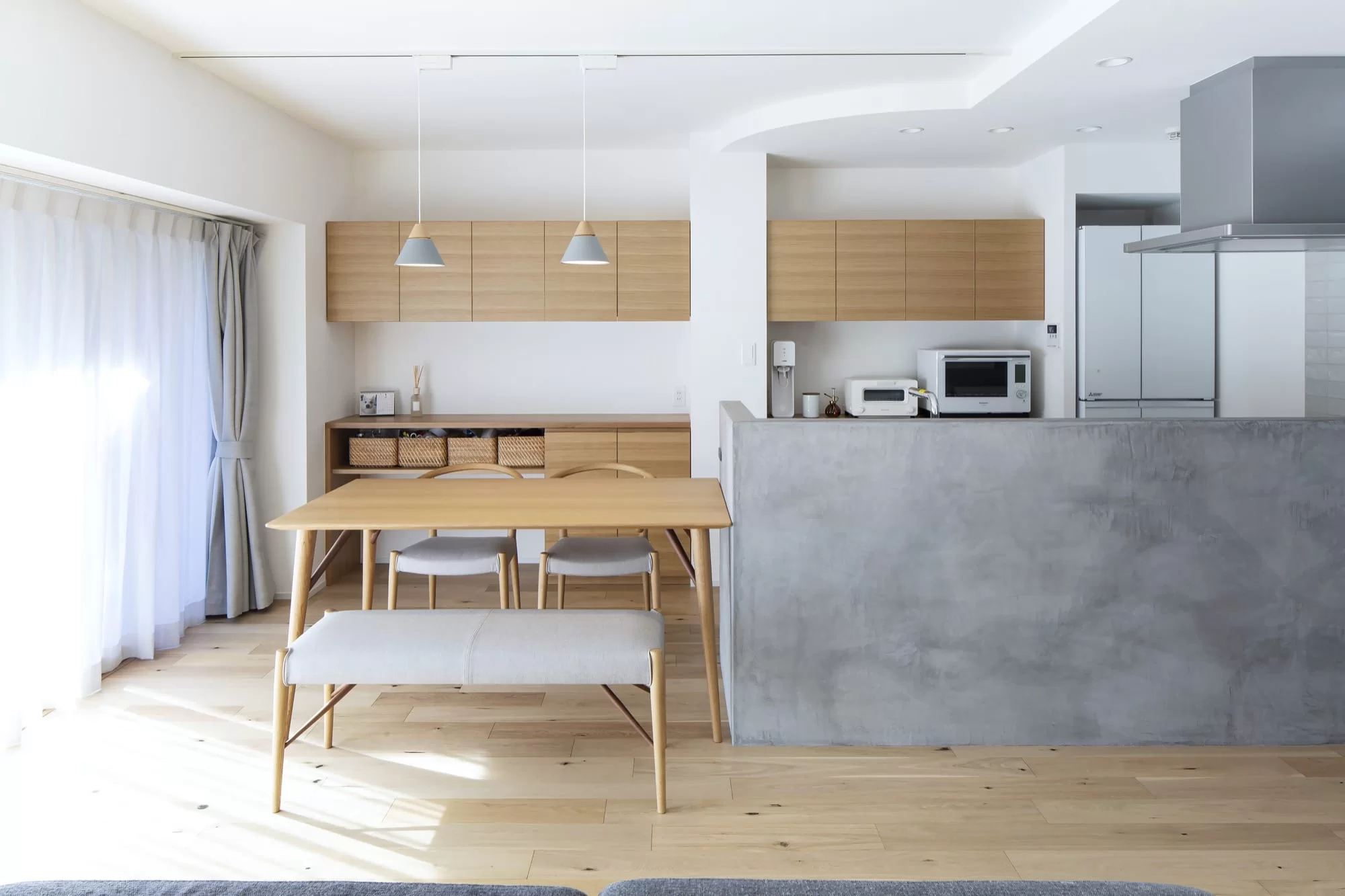 ナチュラルな家具があうようにベージュ、白、グレーをメインカラーにおいたお住まい。キッチンのダクトつくったR(曲線)の天井の美しいラインが見事に調和しています。