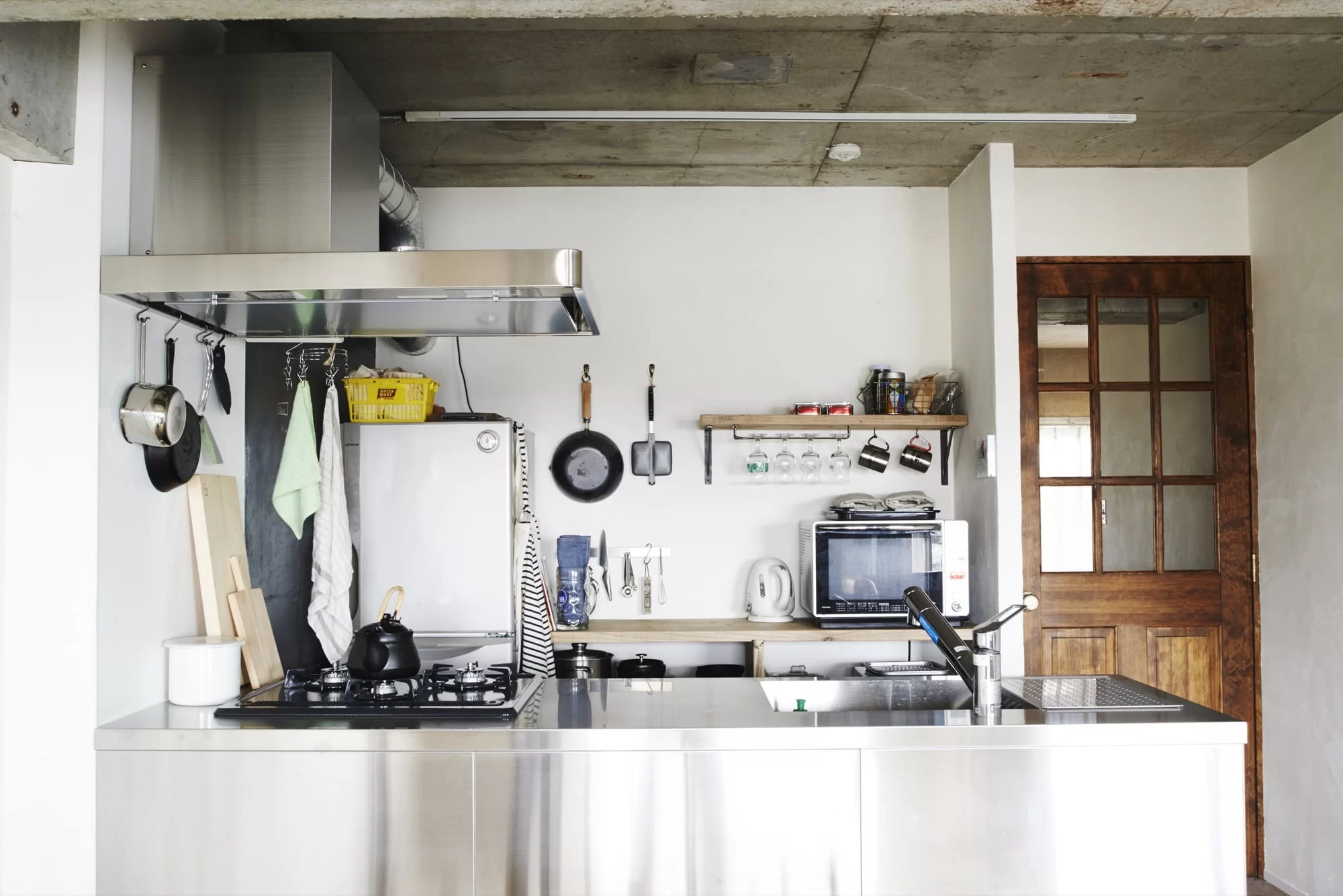 ステンレスキッチン、ダクトあらわし、天井と梁のコンクリートというクールな印象とは対照的に、造作棚やカウンターには木の質感を。全体の雰囲気をマイルドに。強くなりすぎないスタイリッシュさを実現しています。
