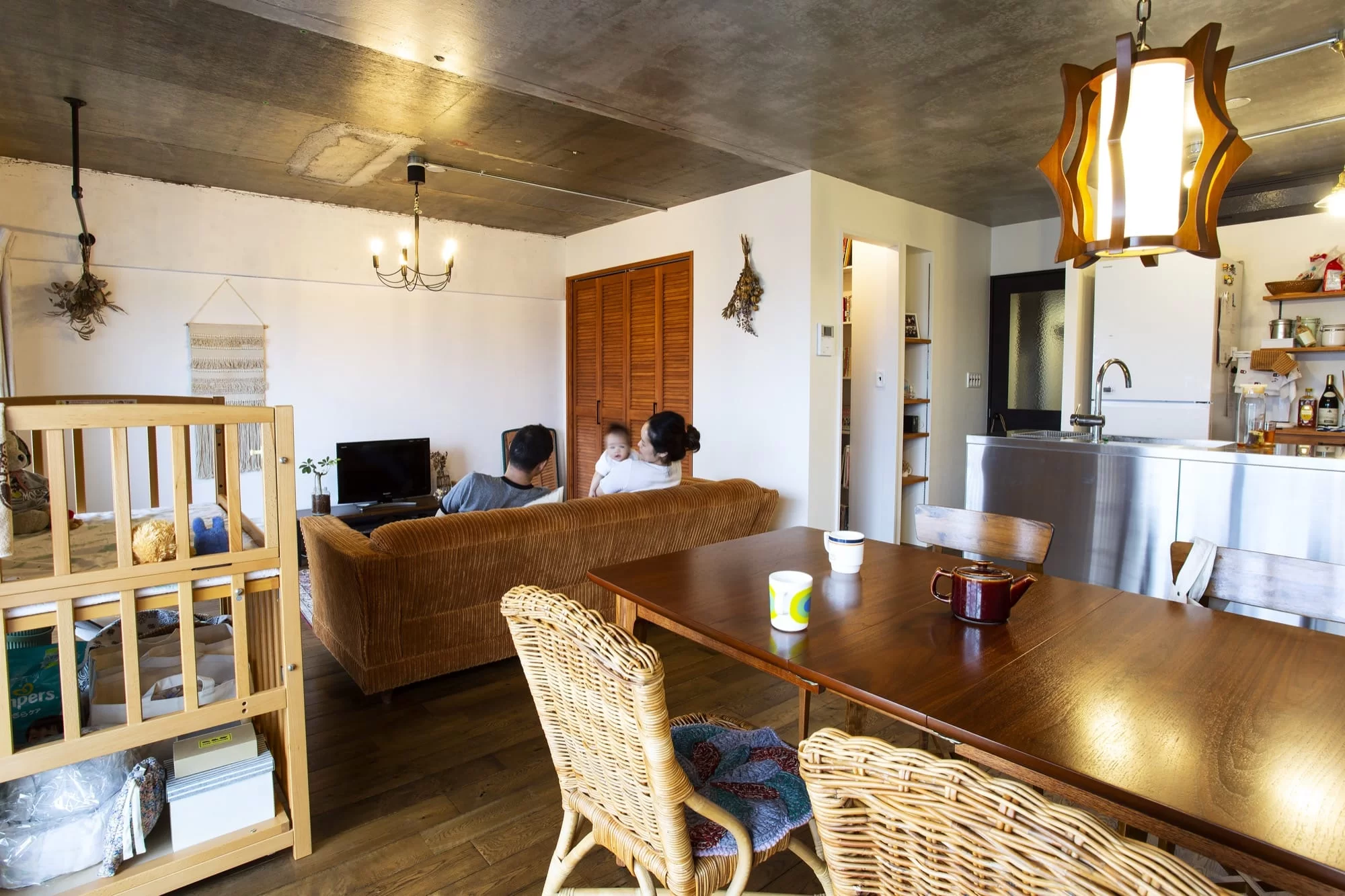 クールでスタイリッシュな見た目が印象的なので、躯体表しの天井に似合うイメージが強いかもしれませんが、木の質感をいかしたナチュラルなお部屋でもアクセントになってしっかりとけこんでいる事例も沢山あります。