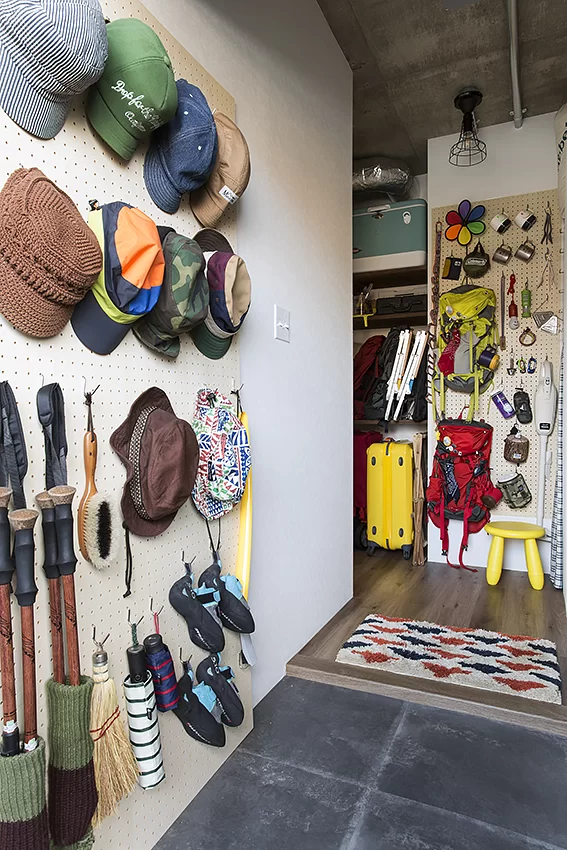 玄関脇にはアクセサリー小物、帽子やリュックまで必要な時にすぐ手の届くおしゃれな見せ方。