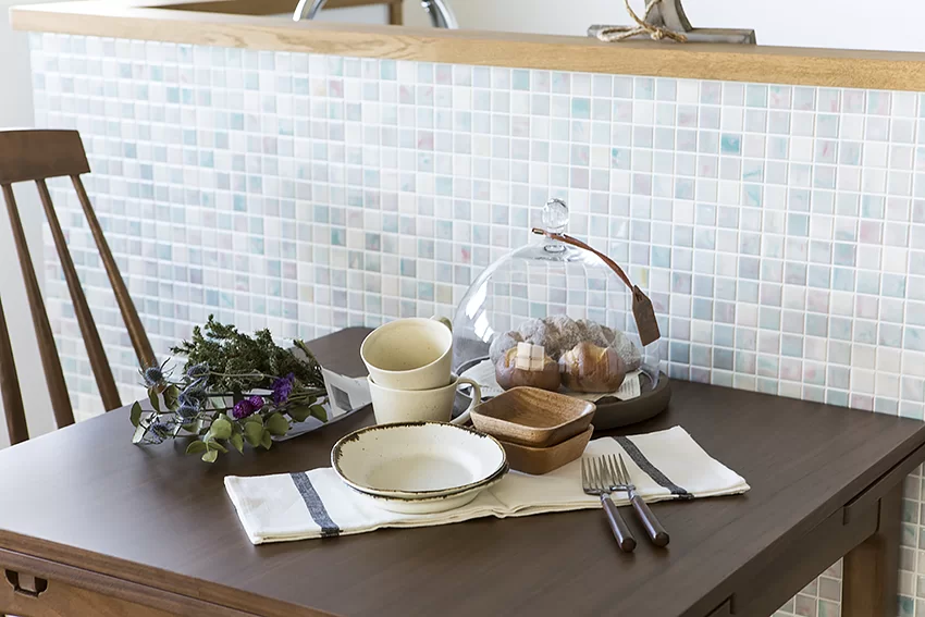 レンガタイルやモザイクタイルなど、タイル貼りとするのも選択枝のひとつです。新築マンションの内装ではあまり使われることはありませんが、リノベーションではキッチン、洗面台などを中心に様々なアイデアで使用しています。