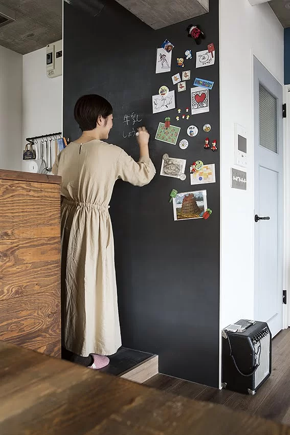 壁にチョークボードペイントといういわゆる黒板塗料で塗装をすると、チョークで絵や文字がかけるようになります。さらにマグネットペイントという鉄粉が入ったペイントを施せばマグネットもくっつくようになります。