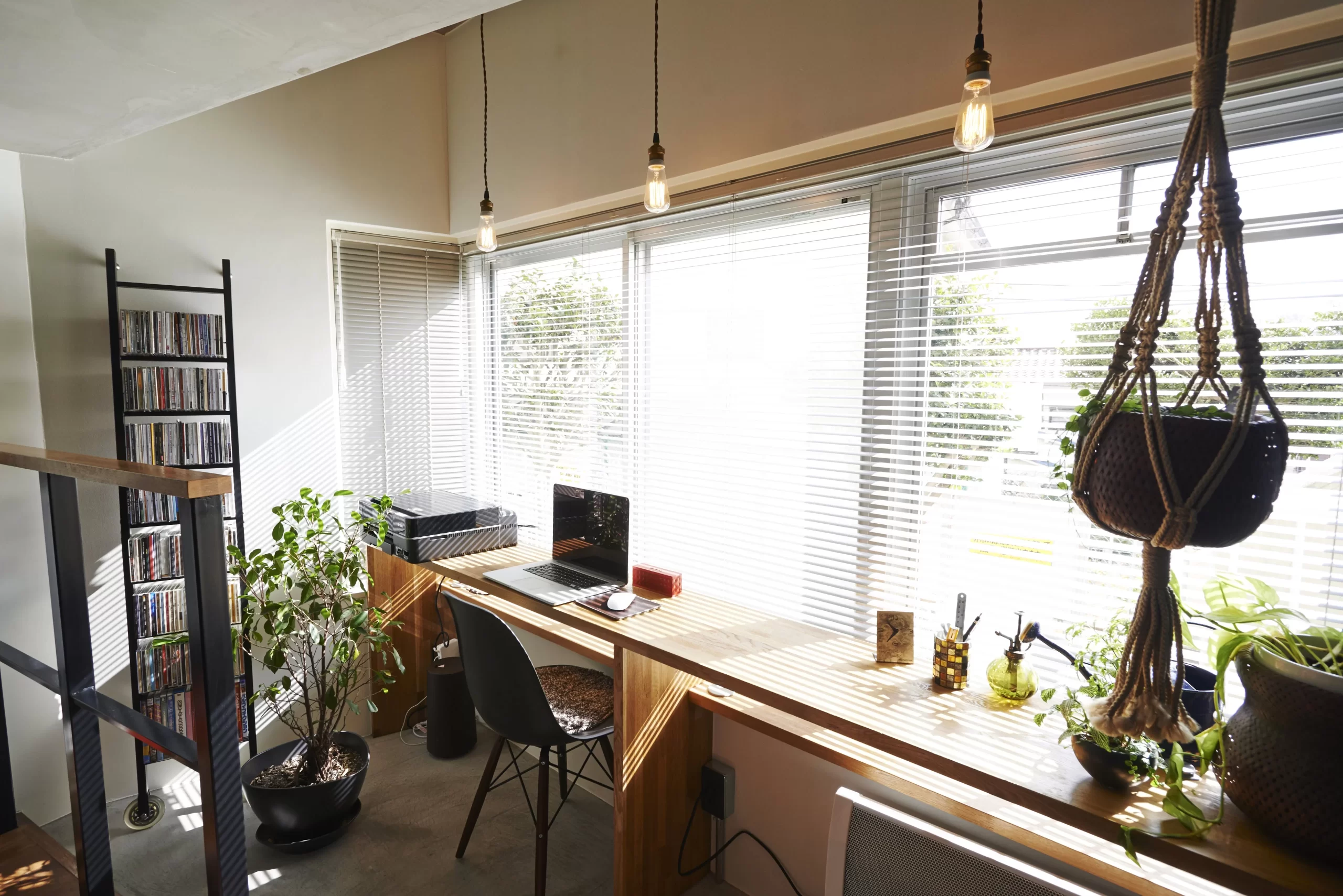 飾り棚やグリーンを下げたり、木のアクセサリーをつけたり。