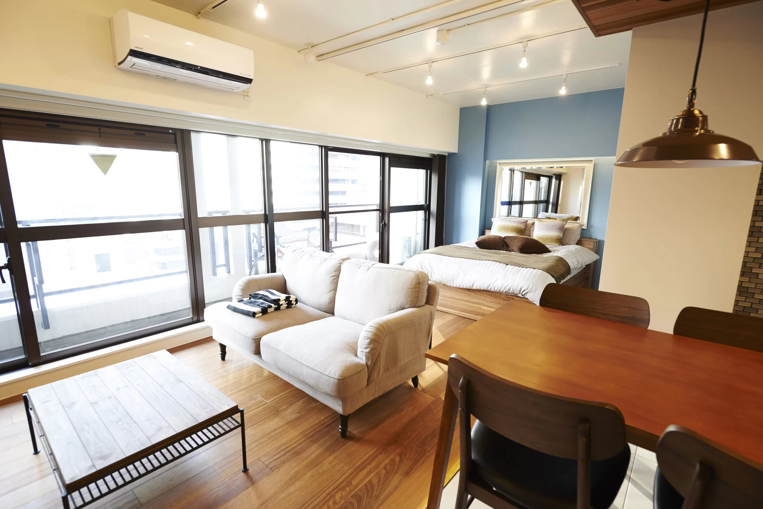 そこに鏡をつけるだけでまるで向こうに部屋があるかのような解放感。