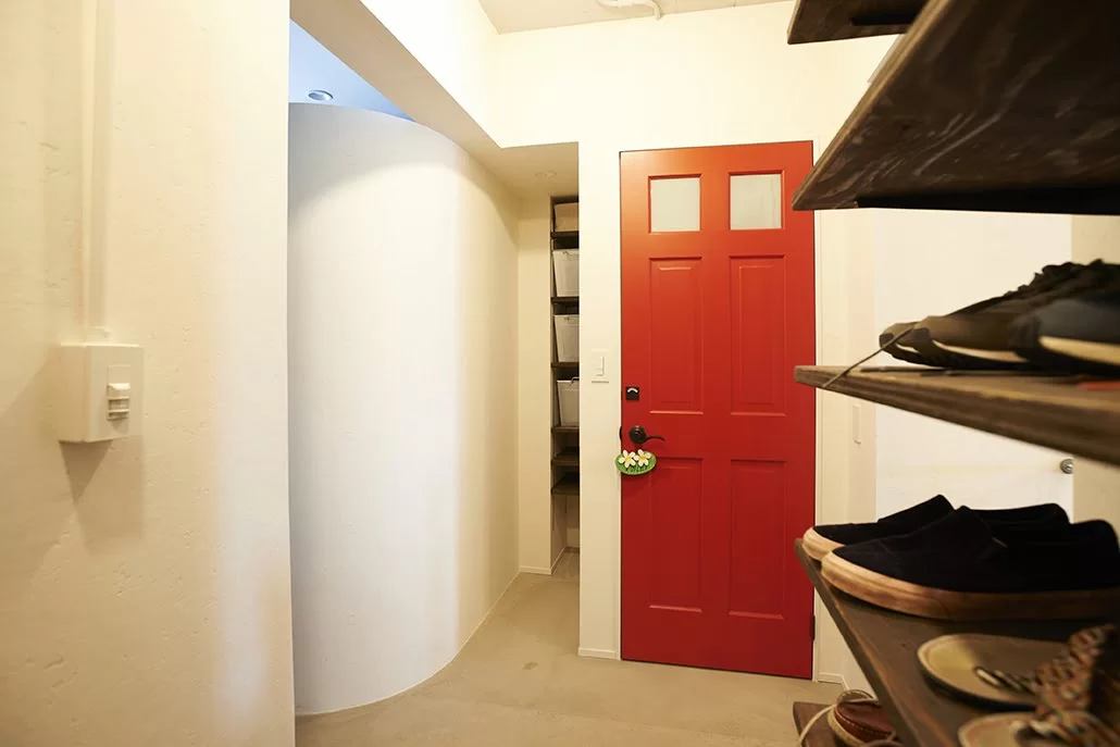 Rとは曲線のこと。ちょっと狭い玄関に曲線の壁をつくったりするだけで、空間の広がりと柔らかい印象が加わります。