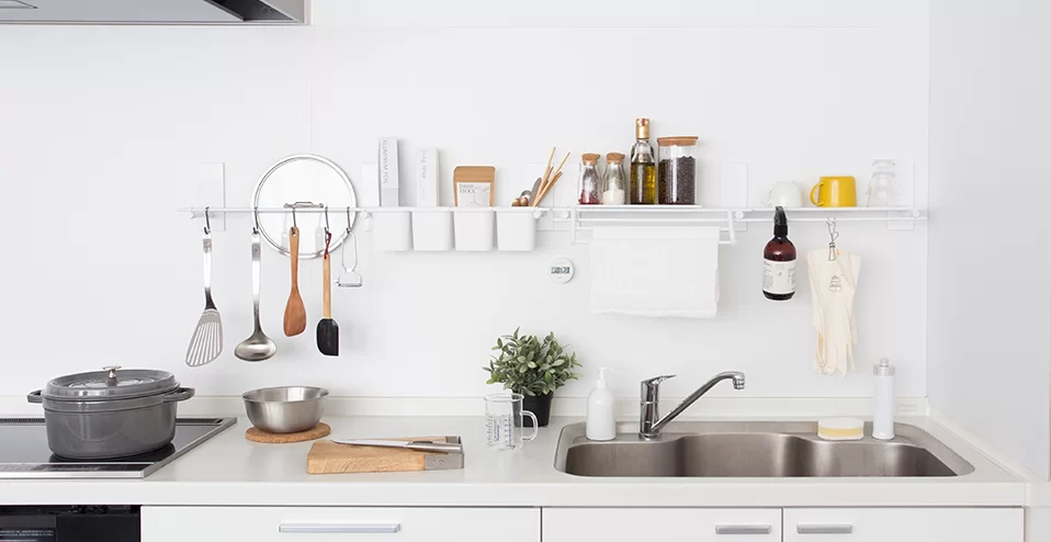 スチール製の壁をキッチンやトイレなどに貼ること自由自在にマグネットで収納。