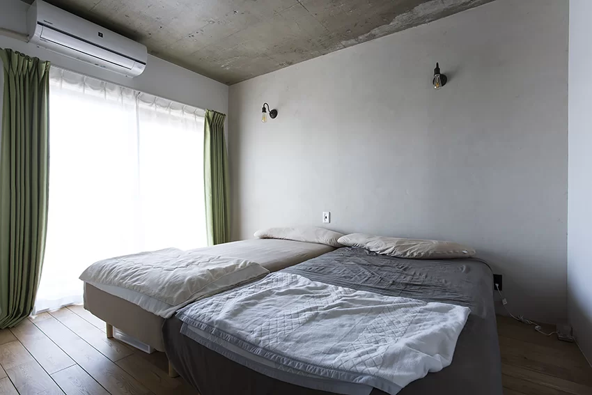 躯体は普通、表面の補修などをしません。不陸や型枠の跡など、でこぼこが残っているのが一般的です。コンクリート現し(あらわし)仕上げは、そうした無機的なコンクリートの素地そのものの味わいを楽しむインテリアです。表面をパテ処理や上塗りなどで仕上げて、独特のシャビーな風合いを出すことも可能です。