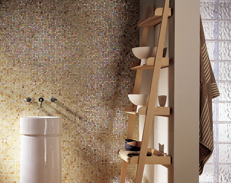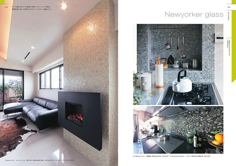モザイクタイルの代表的なものが、ガラス素材を組み入れたもの。例えば、この名古屋モザイク工業のニューヨーカー・グラスは、カラーやサイズのバリエーションが豊富で、いずれも渋めのテイストのもので、繊細な表情と大人っぽい雰囲気を作ることがでみます。