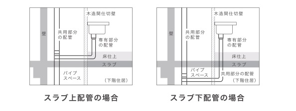 スラブとはコンクリートのことを指し、スラブ下配管とは床下コンクリートスラブと階下天井板との間に設置された排水管のことです。