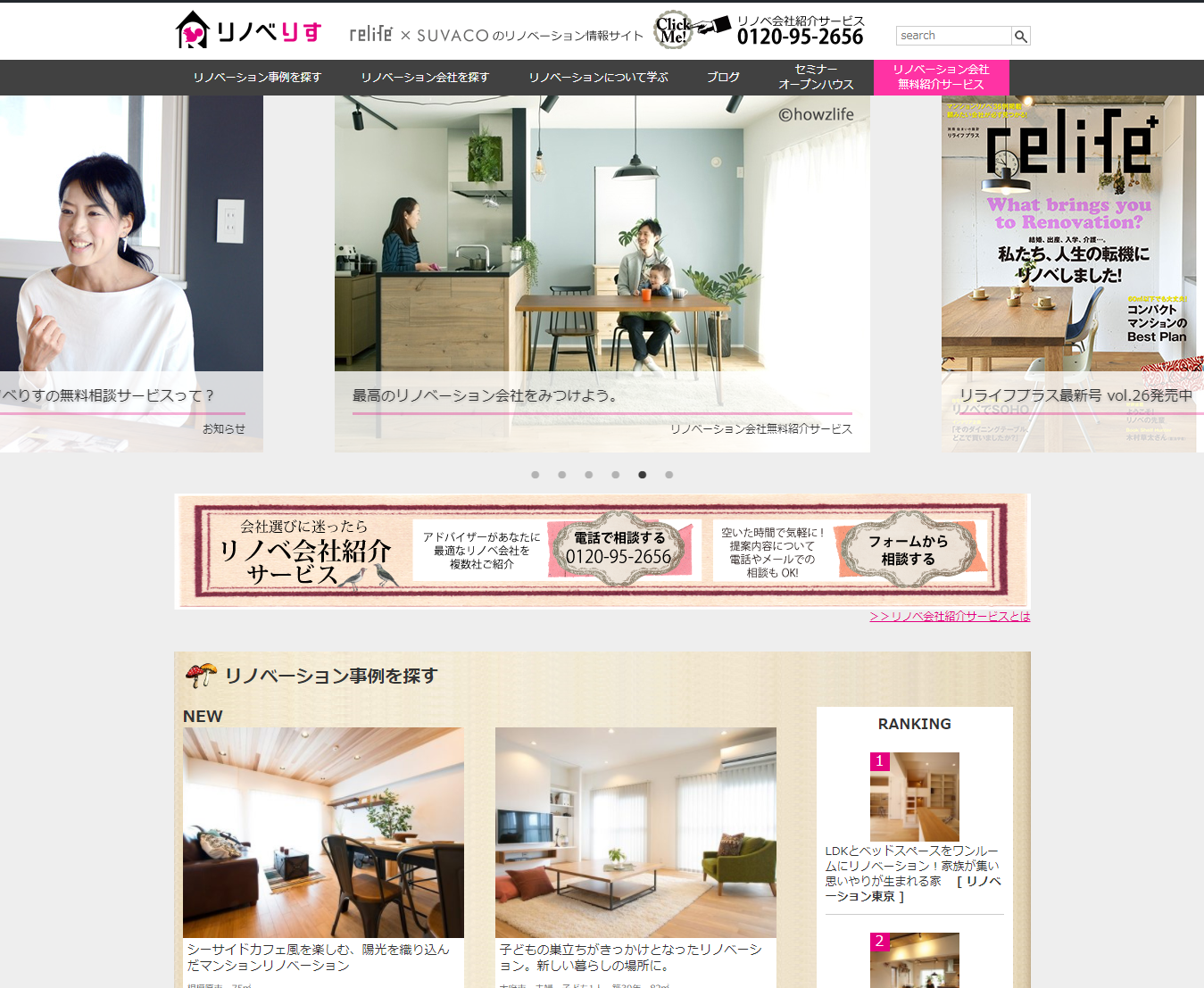 「リノベりす」は扶桑社の中古マンションリノベーション情報雑誌「relife+(リライフプラス)と、ソーシャル・ホームデザイン・サイト「SUVACO」のコラボレーションで運営しているサイトです。