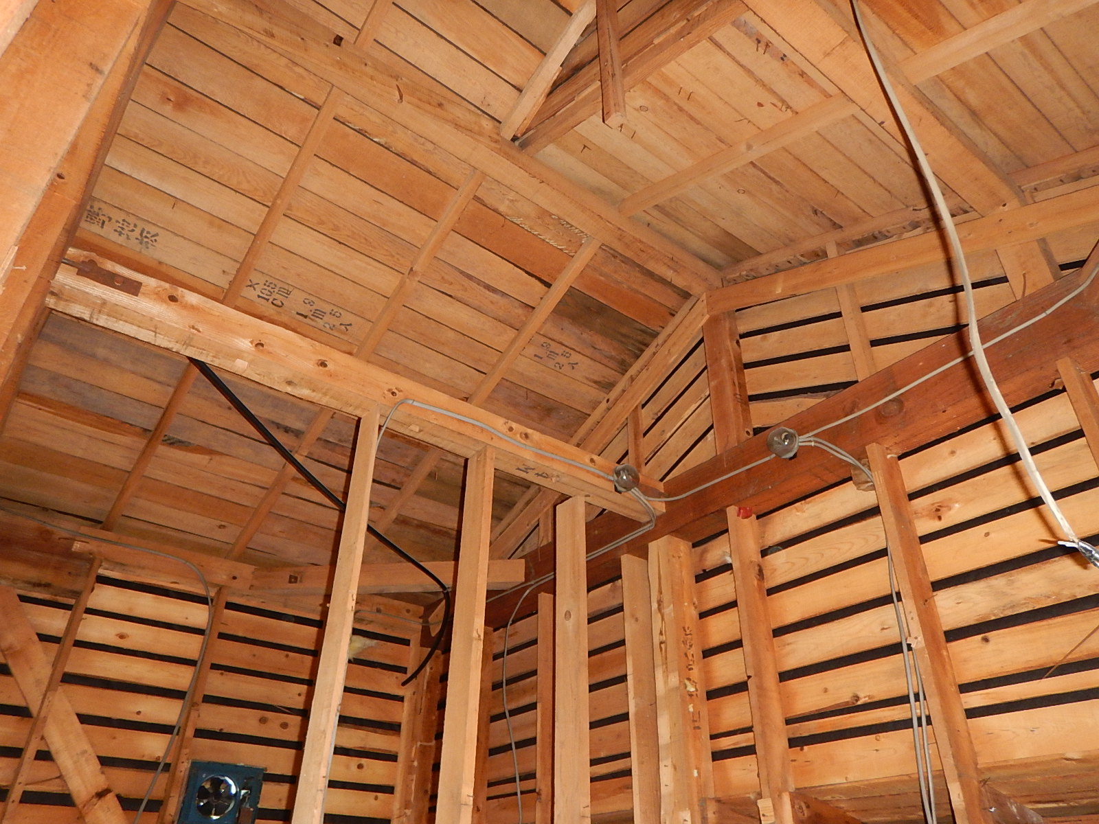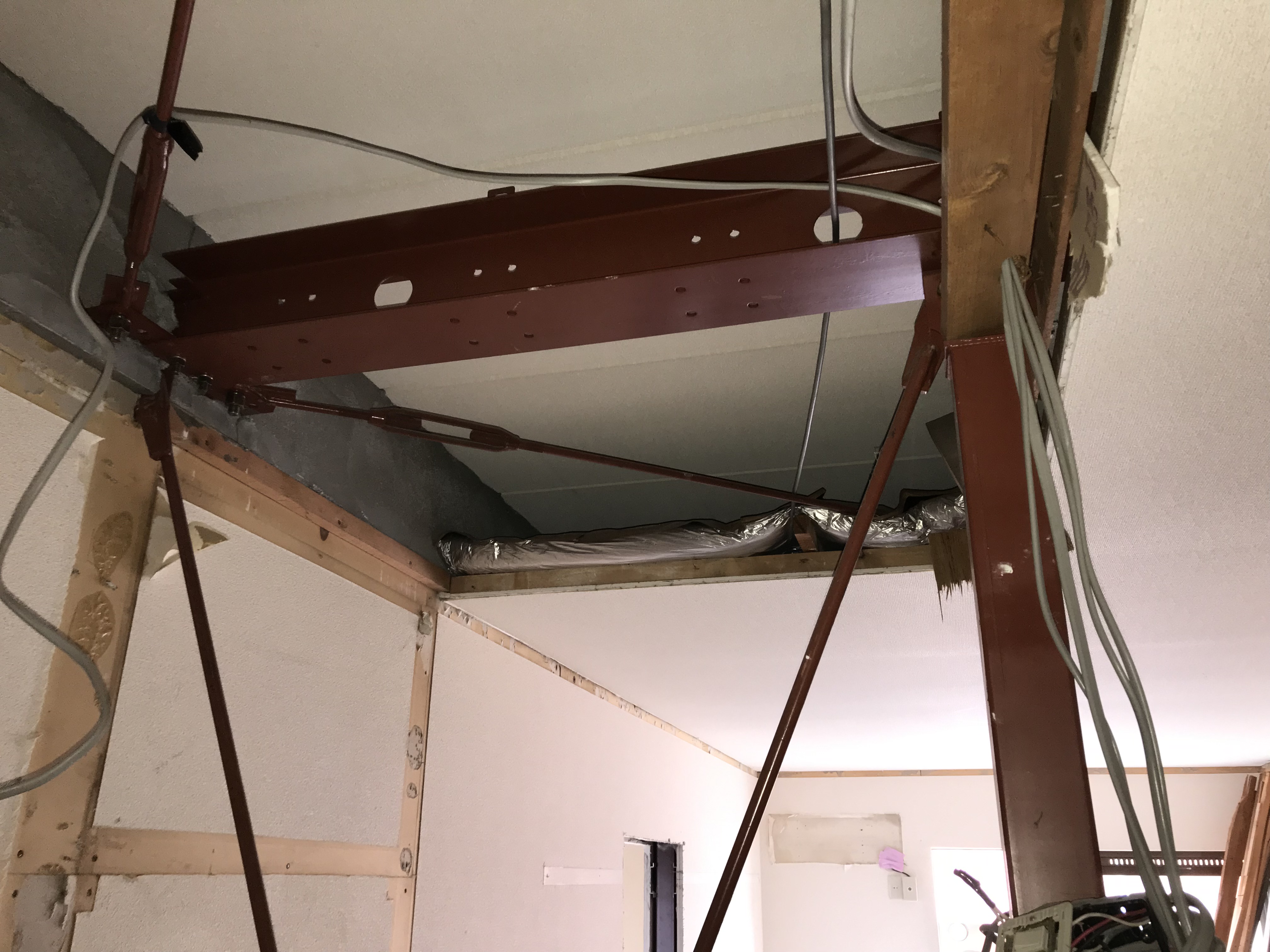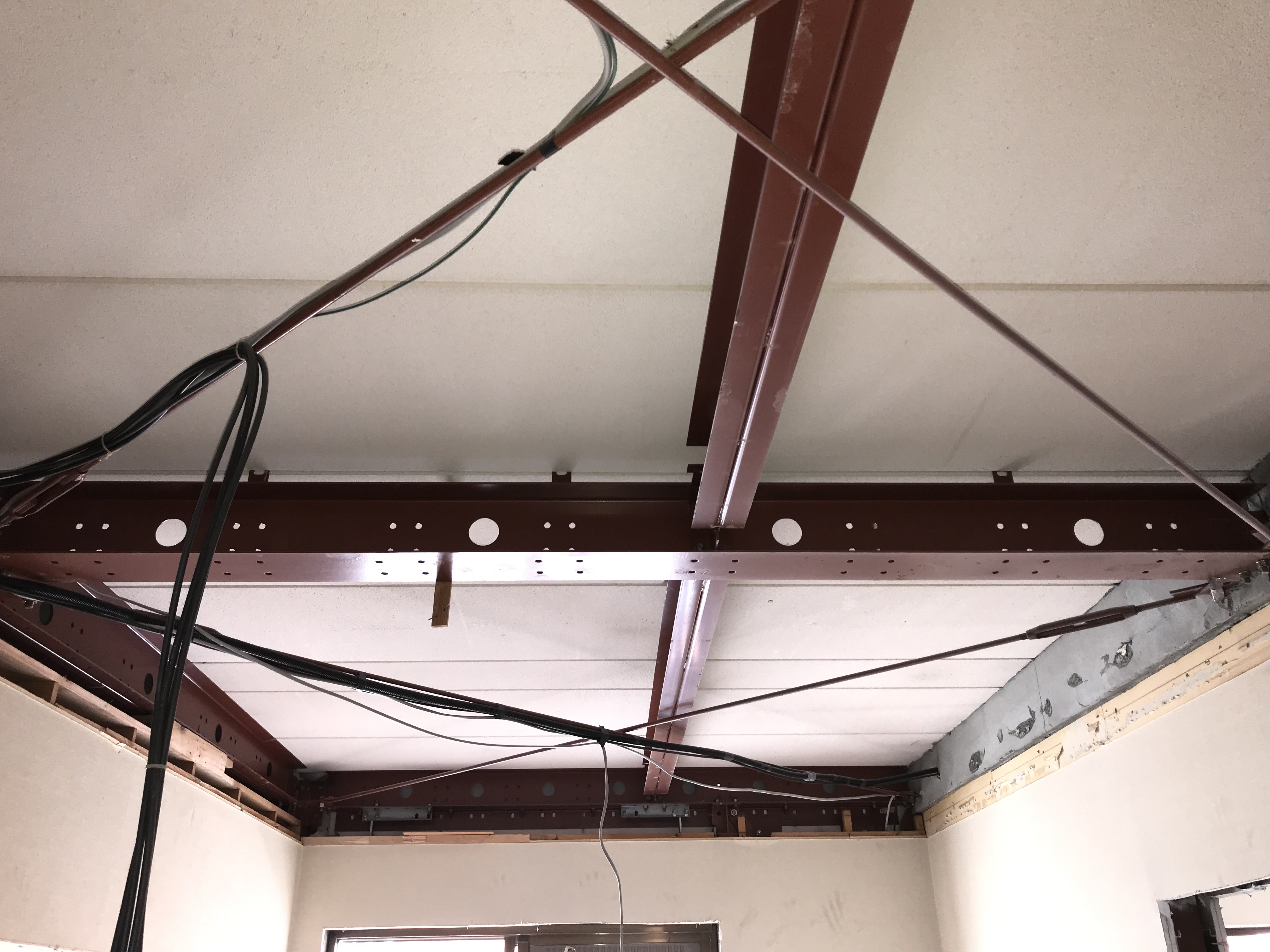 こちらは鉄骨の柱やブレースなどで構造部分をつくり、内部の間仕切り壁などは木下地でできているような建物です。