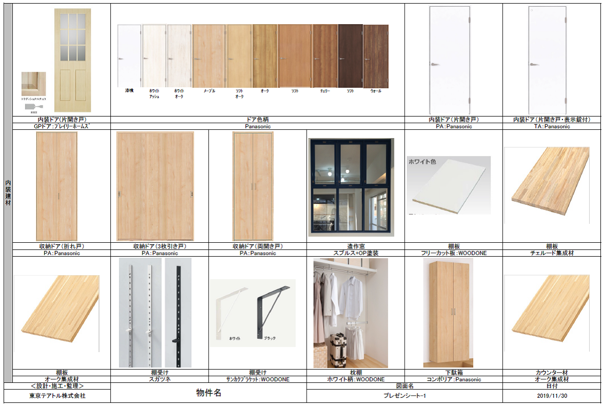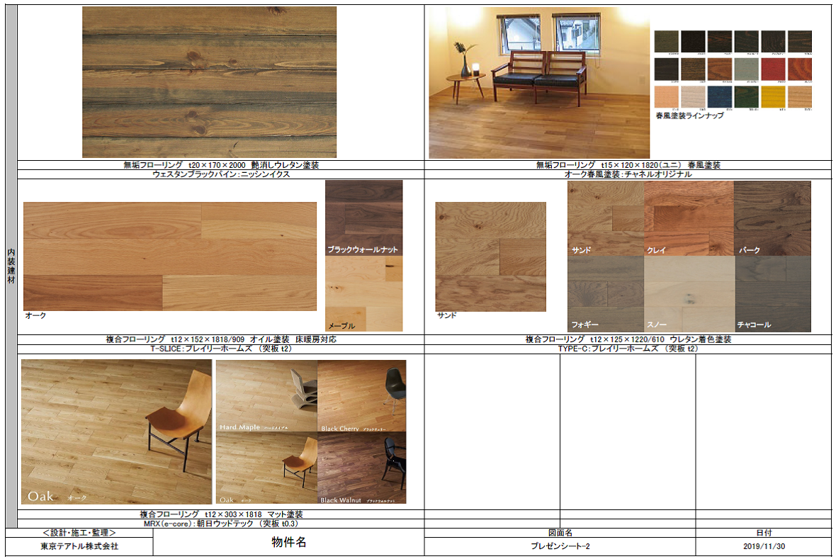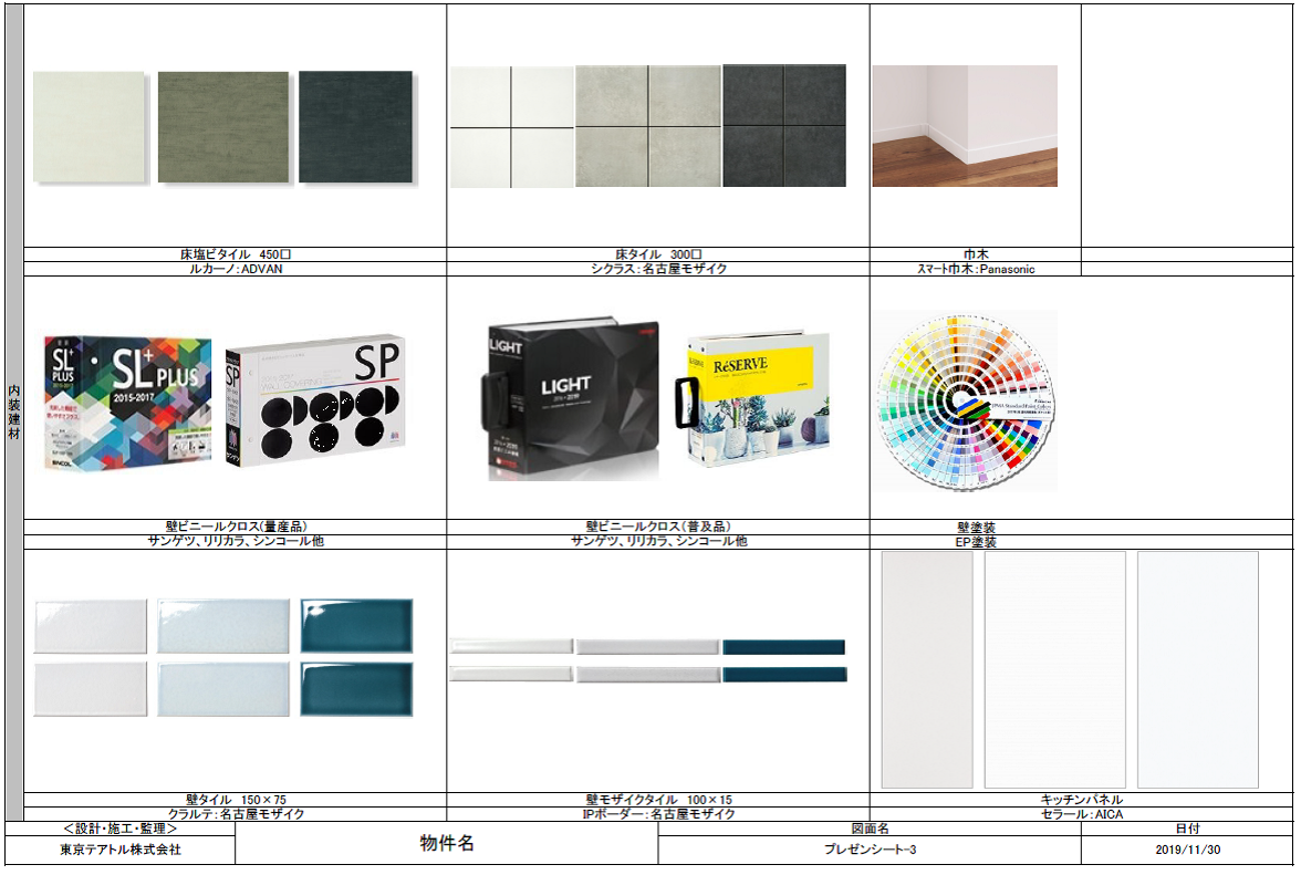 壁や床などで使う素材や採用した設備などの詳細がわかる資料をまとめたものがプレゼンシートです。