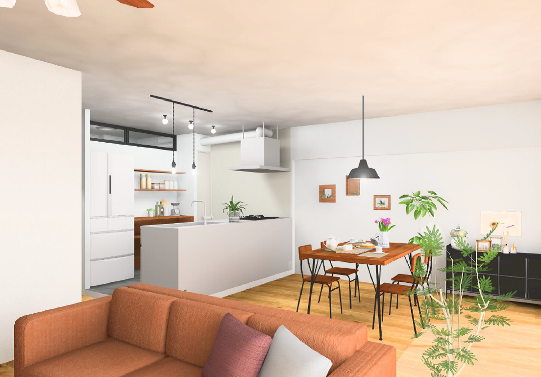 図面をもとに完成予想図を立体的にあらわした図です。単に完成後の画というだけでなく、ソファーやテレビなどの家具も書き込んでみるとよりイメージがわいてきます。