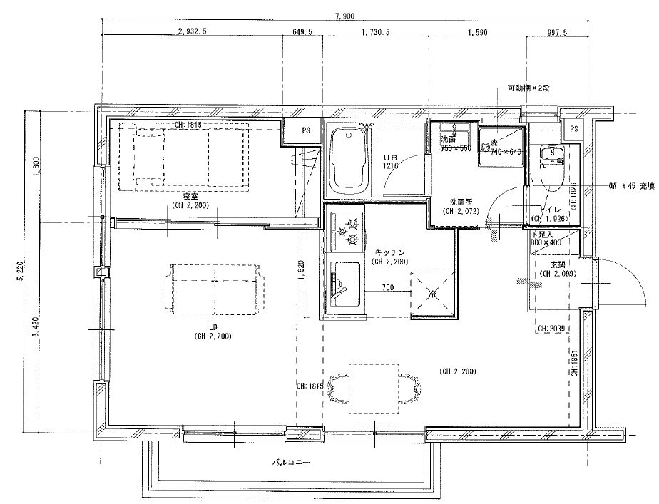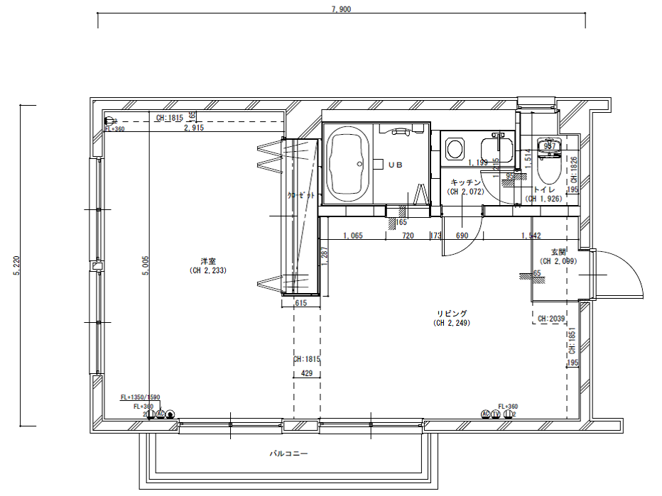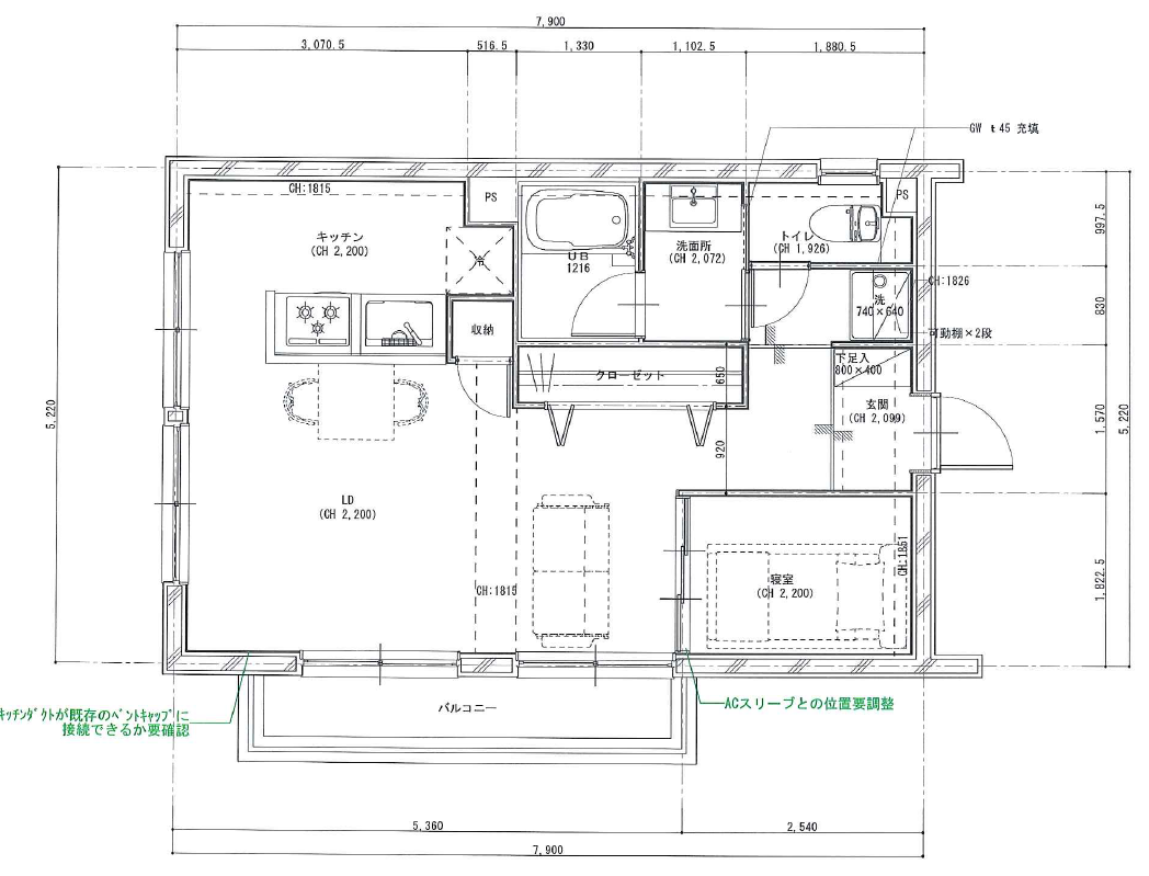 リノベーション前の既存の状態での間取りや寸法、天井高などを示した平面図です。