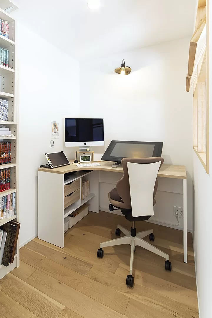 旦那さまのワークスペースは玄関脇。奥様のワークスペースからもリビングからも遠い場所につくっています。仕事に集中できるようにコンパクトなスペースにしています。
