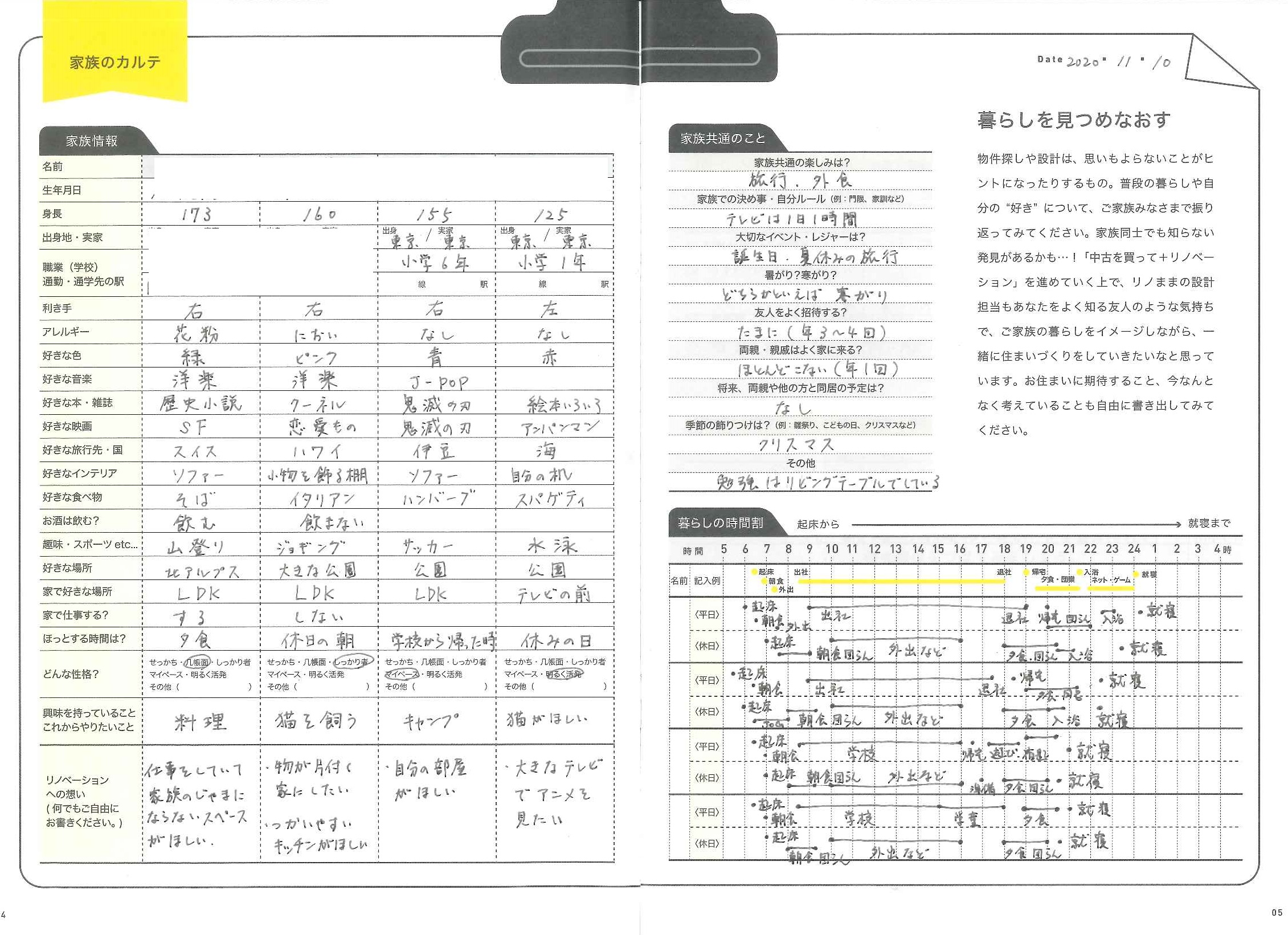 並行して、“Renovation Guidebook” の家族カルテの項目を書きながら、これからの生活や家での暮らし方を書き出してみました。