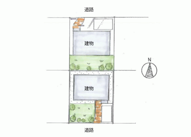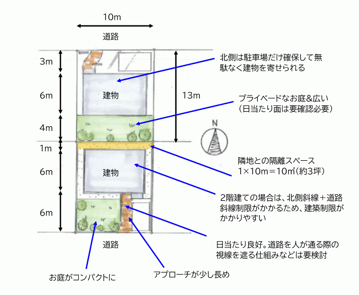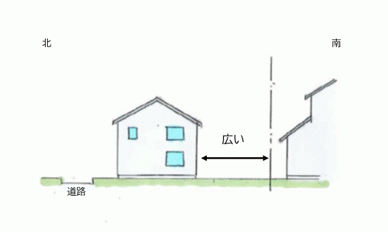 北道路付けだと、どうしても日当たりや通風がとりづらい土地がありますが、次のように日当たりが確保できる場合、デメリットを解消できるかもしれません。