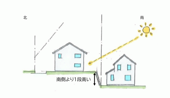 上記のように南側が1段下がっている土地であれば、日当たりもしっかりと確保できますし、風通しや眺望も良いですよね。