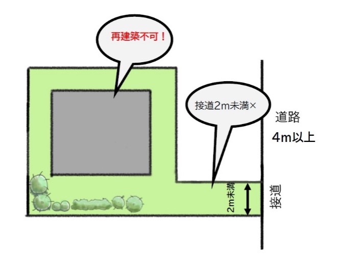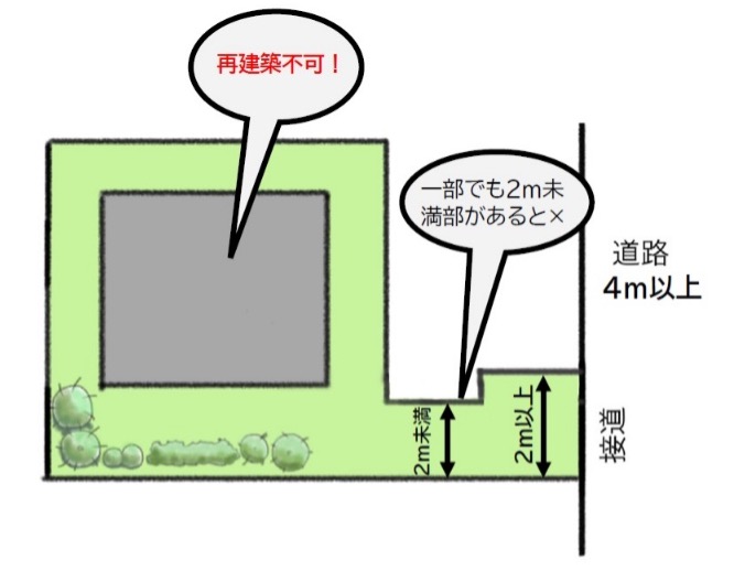 そもそも道路に面していない土地が「再建築不可」とされるのは消防車や救急車といった緊急車両がはいっていけないと災害時に被害を拡大させてしまうから、です。緊急車両がしっかりと建物のそばまで入れるようにするには2m以上の幅の通路が確保できないといけない、ということですね。