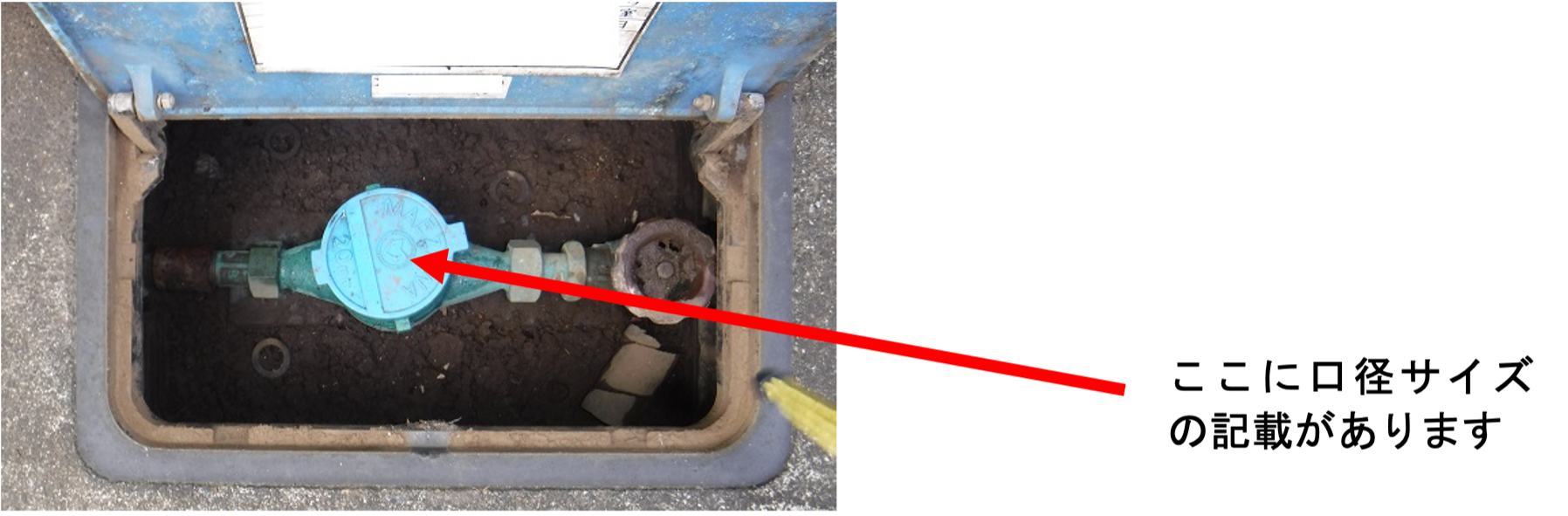 これはさきほどの量水器の蓋を開けると中に水道メーターがあり、口径サイズが記載されています。