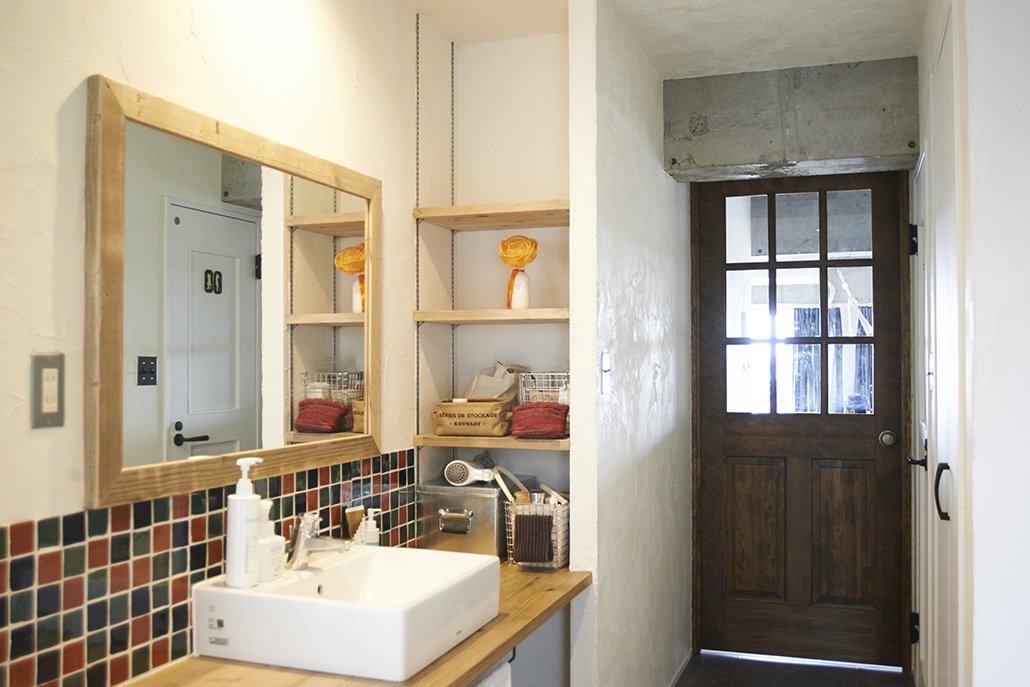 廊下にある洗面化粧台(タイルはお施主様DIY)