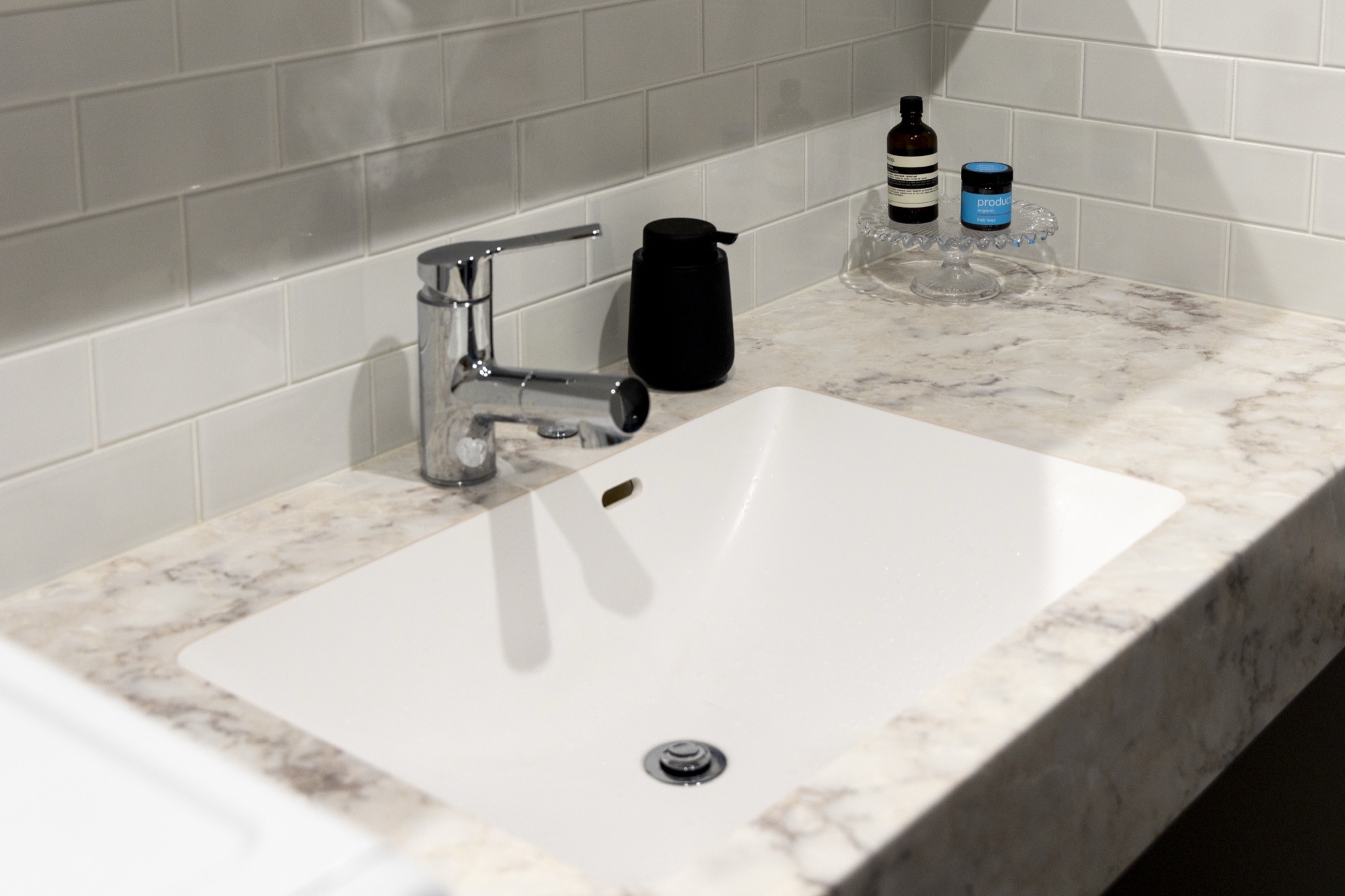 玄関ホールのアクセントクロスや大理石調の洗面台など、日常の中でふと気分が上がるこだわりも取り入れました。