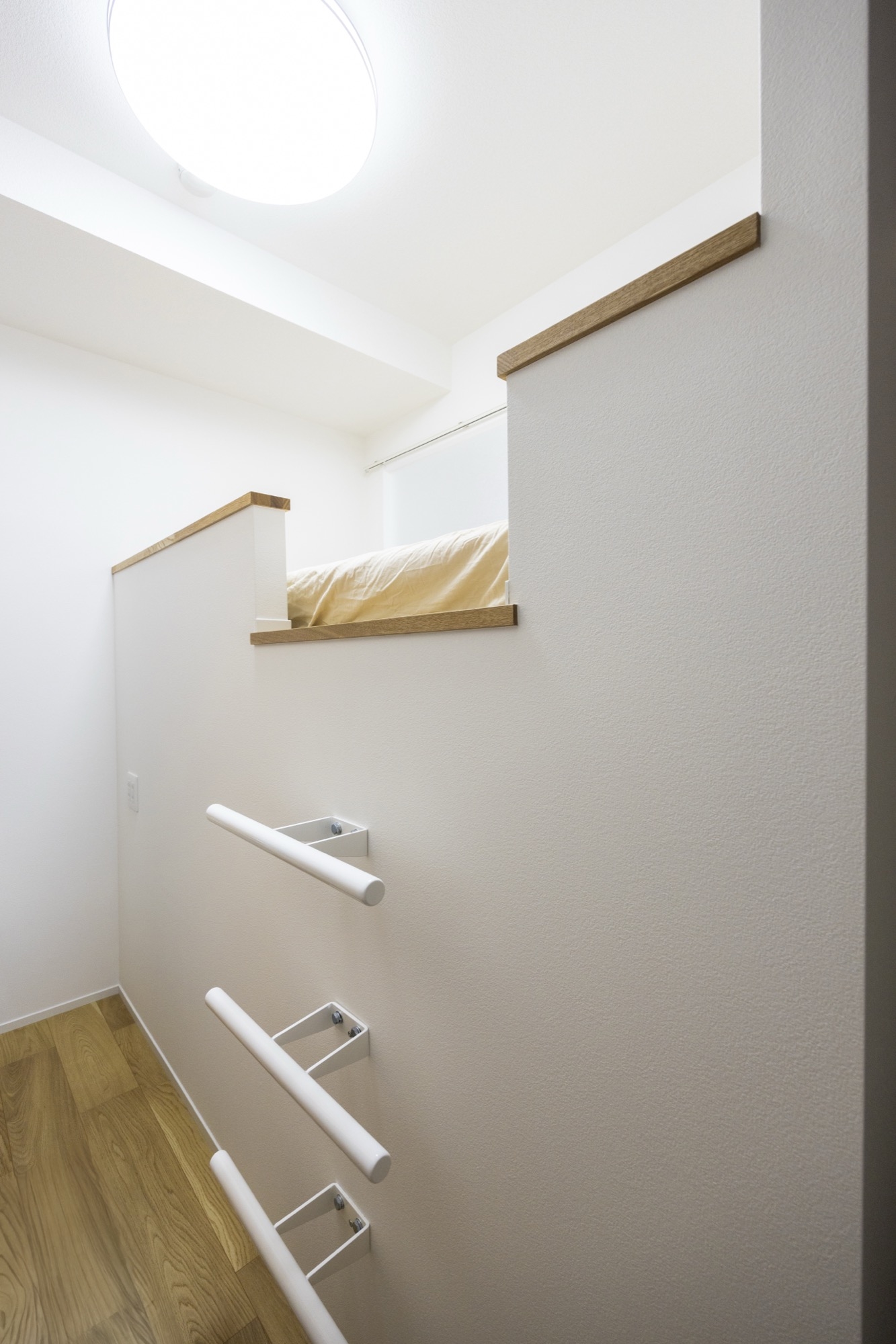 子ども室は互い違いに組んだ二段ベッドが間仕切りの役割も果たし、それぞれのスペースを確保しています。