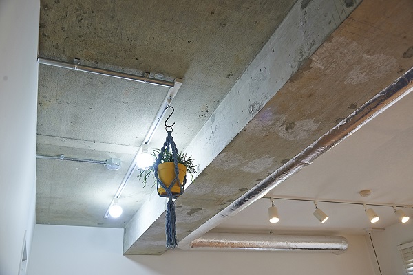天井の一部は打ちっぱなし。コンクリートの素材感を楽しめるような遊びも用意しました。リノベーションのプランを練っていく中で、わずかなスペースながらもきれいなコンクリートの質感が出せることが判明したのでそこからプランを少し変更した結果です。