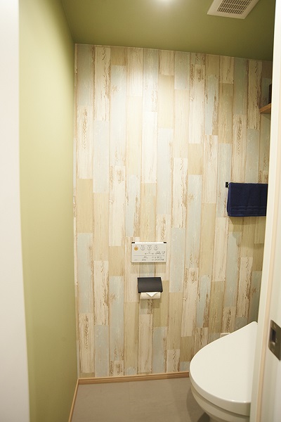 もちろんトイレも手を抜きません。「森みたいにしたい」とクロス張りながらも古材を貼り合わせたようなクロスを使用。小屋にいるような雰囲気にしあげました。