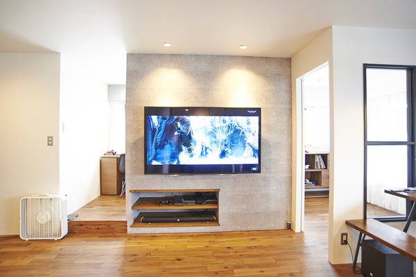 ゲーム機・スピーカー・HDDなどでごちゃごちゃしがちなテレビまわりは造作の埋め込み収納ですっきりおさめています。