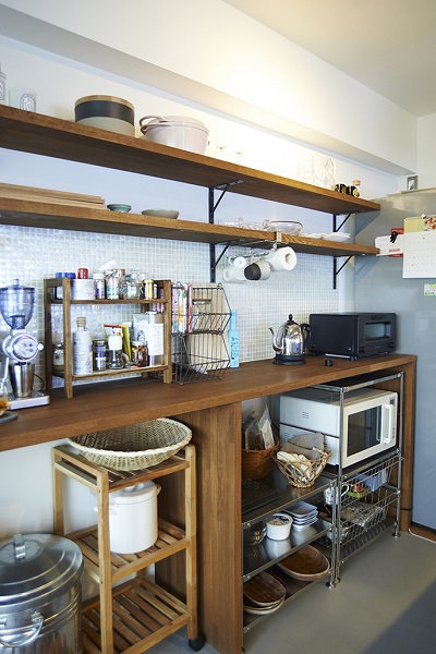 キッチンにつけた造作棚にはお気に入りの食器や電化製品をあえて見せて収納することで、キッチンの雰囲気づくりを手伝ってくれています。