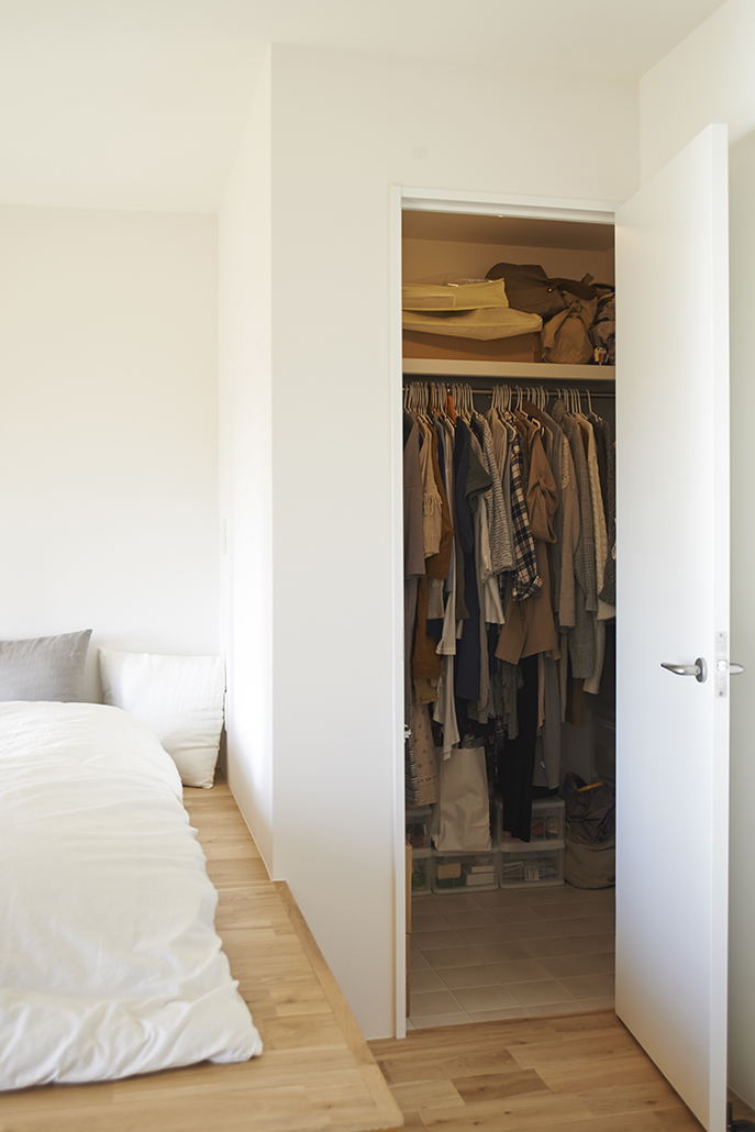 リビングのすぐお隣には寝室を。その寝室には、ベットも収納家具も置かずに済むような工夫がなされています。それは造作でつくった小上がり。
