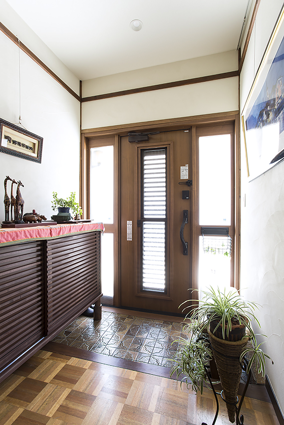 日中は常に光が入るように、玄関扉自体に窓ガラスのついたものを。