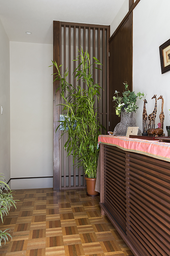 右側には、既存の床に合わせた色味の木の家具を設置。