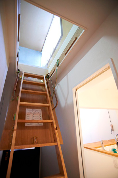 廊下の天井からのびるはしごをのぼると、屋根裏を利用した収納スペース「グルニエ」につながります。